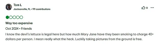 The restaurant, a major draw for many, was also criticized as ‘overpriced and mediocre,’ with one user sarcastically remarking, ‘I know the devil’s lettuce is legal here, but how much Mary Jane have they been smoking to charge 40+ dollars per person?’ Another visitor even suggested that taking photos from the ground was ‘free’ and just as rewarding.