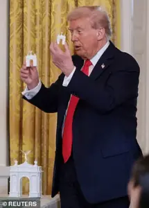 When hosting ballroom donors in the East Room in mid-October, he touted the arch as well. ‘Every time somebody rides over that beautiful bridge to the Lincoln Memorial, they literally say something is supposed to be here,’ he said. ‘We have versions of it … this is a mockup.’ He pointed out the Arlington Memorial Bridge and the vacant traffic circle. ‘In 1902, they were going to put a statue of Robert E.