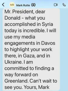 In a text exchange shared on social media, Rutte wrote: ‘I am committed to finding a way forward on Greenland.