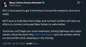 Mamdani also warned that potential school closures may be announced in the coming days and urged residents to sign up for emergency notifications. ‘Stay warm.