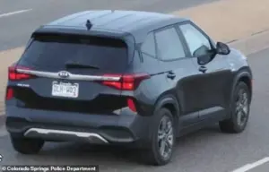 Chief Adrian Vasquez said a black 2021 Kia Seltos pictured above was stolen with two-year-old Giovani Salazar-President inside shortly before 3pm on Tuesday in Colorado Springs