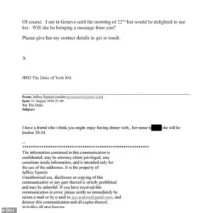 The exchange, dated August 2002, reveals a personal and affectionate tone between Maxwell and the anonymous figure, with Maxwell referring to him as ‘Andrew sweetheart’ and expressing that she ‘will miss him’ and ‘loves him lots.’ These remarks, buried within a broader set of documents released as part of the U.S. ‘Epstein files,’ have drawn speculation about the identity of ‘The Invisible Man,’ with some suggesting he may be Andrew Mountbatten-Windsor, the younger brother of Prince Philip, Duke of Edinburgh.